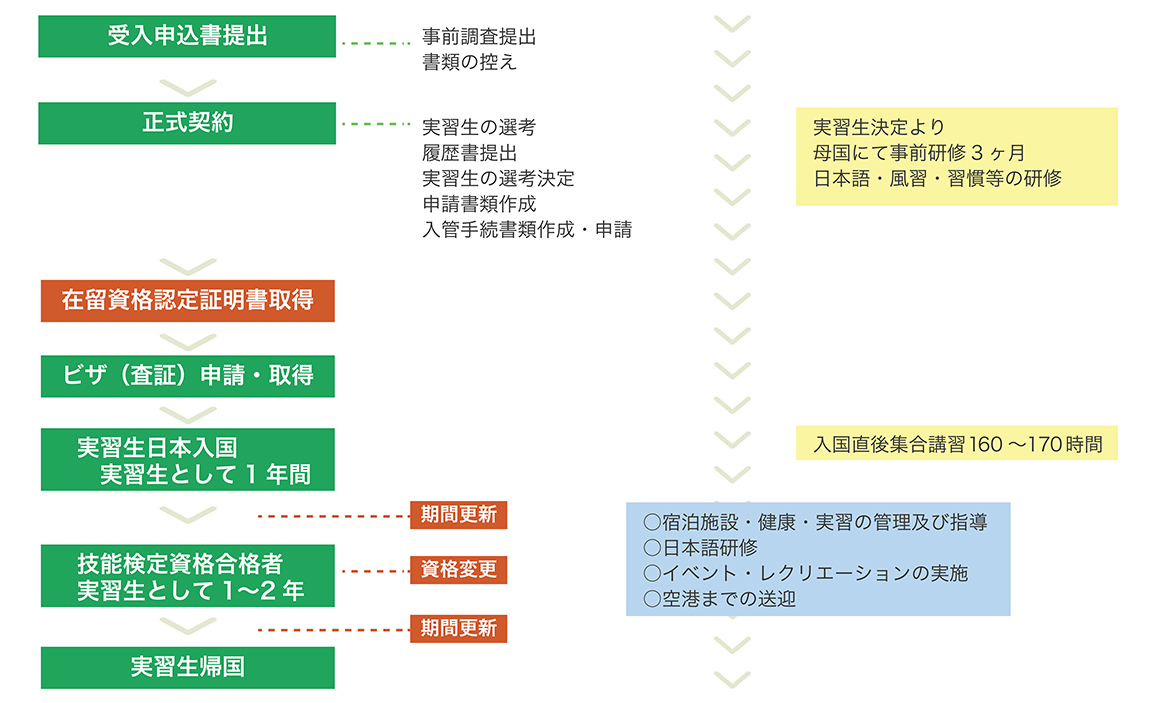 | 入国後講習 | <1~2ヶ月間> 入国、実習 |